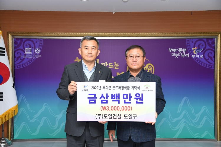 ㈜도일건설(대표 도일구)은 지난 23일 부여군청을 방문해 지역 향토인재 육성을 위한 장학금 300만원을 (재)부여군굿뜨래장학회(이사장 박정현)에 기탁했다.