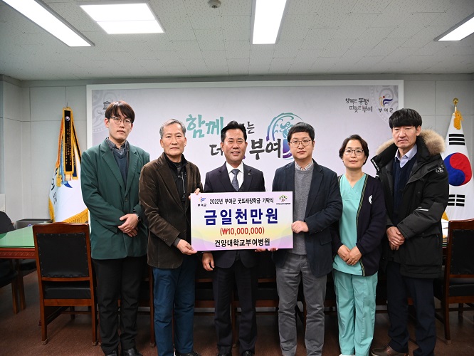 건양대학교부여병원(원장 이정섭)이 지난 22일 부여군청을 찾아 지역 인재를 위한 굿뜨래장학금 1,000만원을 부여군굿뜨래장학회(이사장 박정현)에 기탁했다.