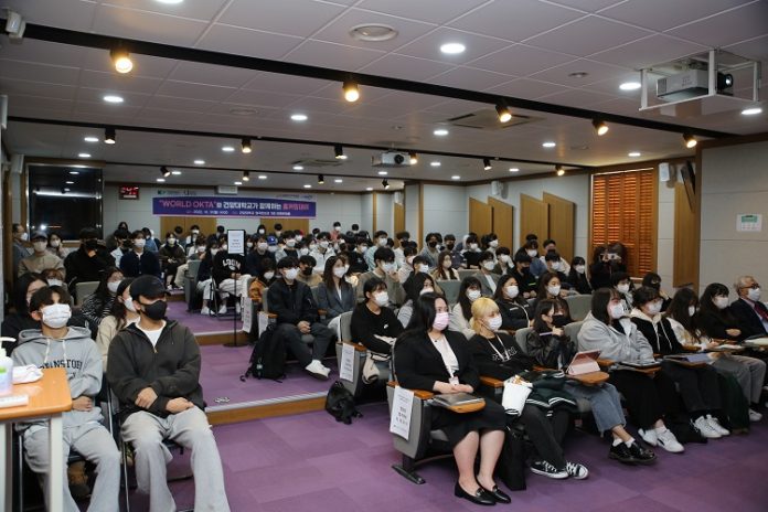 건양대학교(총장 김용하)가 31일 오후 세계한인무역협회(WORLD-OKTA, 회장 장영식, 이하 월드옥타)를 창의융합캠퍼스로 초청해 재학생들을 대상으로 한 취창업 특강 및 취업관련 멘토링 프로그램 행사를 진행했다.