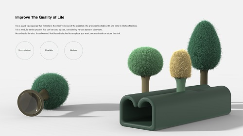 2023 iF디자인어워드 첫 번째 수상작인 ‘Woody’는 한 손이 불편한 지체장애인이 두 손을 써야 하는 설거지를 할 수 없다는 점에 착안해 한 손으로도 설거지를 할 수 있도록 고안된 제품이다.
