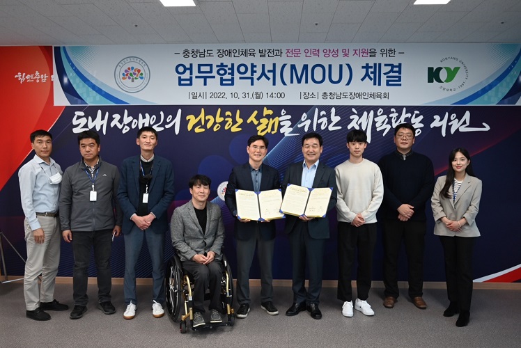 건양대학교(총장 김용하) 재활퍼스널트레이닝학과(학과장 백광)와 충남장애인체육회(사무처장 변현수)가 31일 충청남도 장애인체육회 회의실에서 충청남도장애인체육 발전 및 전문 인력 양성·지원 체계 구축을 위한 업무협약을 체결했다.