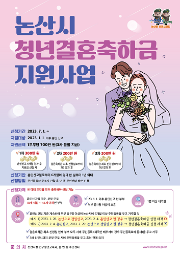 한편, 논산시는 지역소멸 위기를 타개하기 위해 결혼 장려 뿐 아니라 충남 남부권 유일의 공공산후조리원 건립 추진(‘25년 완공), ‘아이키우기 좋은 안전망 조성’을 통한 임산부, 영유아를 위한 24시간 응급진료서비스 체계구축, 소아응급진료 최신식 의료장비 정비 구축 등 새로 탄생하는 가정을 위한 다양한 정책을 펼치고 있다.