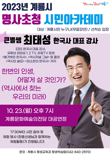 계룡시(시장 이응우)가 오는 23일 계룡문화예술의전당 대공연장에서 2023년 두 번째 계룡시 명사초청 시민아카데미를 개최한다고 밝혔다.