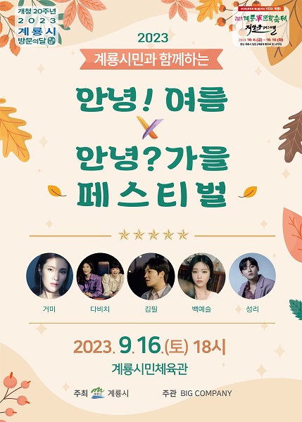 계룡시(시장 이응우)가 오는 16일 오후 6시 계룡시민체육관에서 ‘안녕! 여름, 안녕? 가을 페스티벌’을 개최한다고 밝혔다.