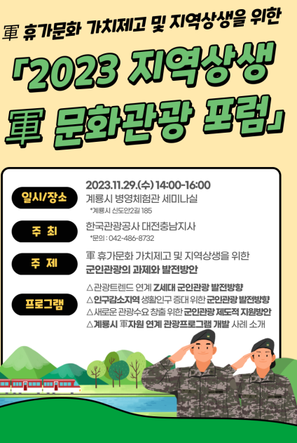 계룡시(시장 이응우)는 오는 29일 계룡병영체험관에서 한국관광공사 대전충남지사와 함께 ‘2023 지역상생 군문화관광포럼’을 개최한다고 밝혔다.