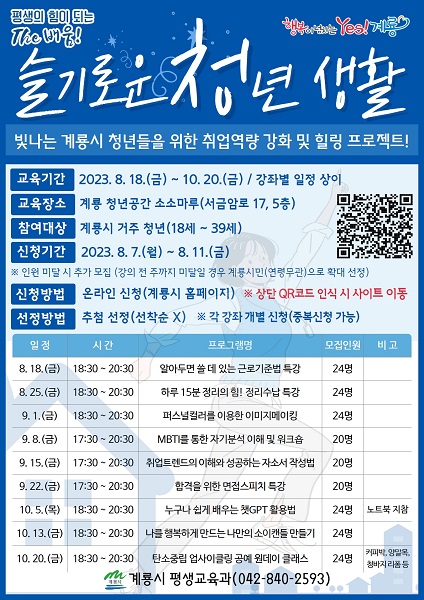 각 강좌는 개별 신청 가능하고, 19세 이상부터 39세까지의 계룡시 거주 청년이라면 누구나 신청할 수 있으며, 교육 신청은 계룡시 홈페이지(분야별 정보-교육/강좌-평생교육-강좌신청)를 통해 온라인 접수 가능하다.