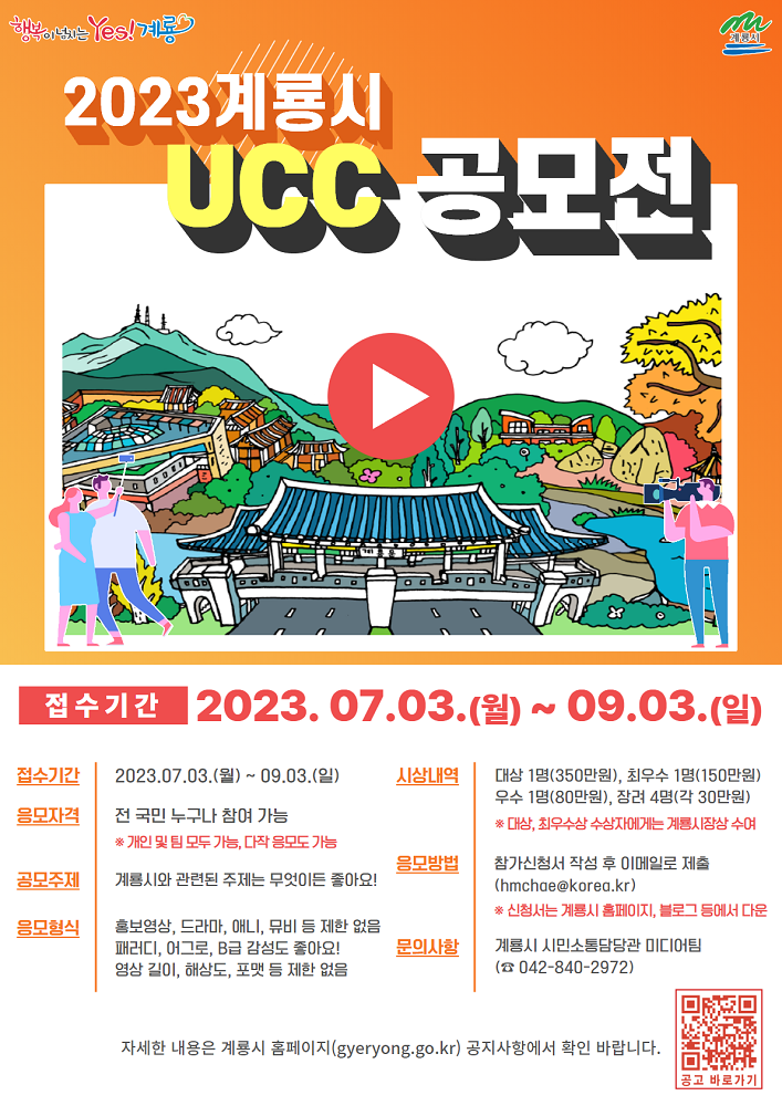 한편 본 공모전과 관련한 자세한 내용은 계룡시청 홈페이지(www.gyeryong.go.kr) 고시·공고란을 확인하거나, 시민소통담당관 미디어팀(☎ 042-840-2972)으로 문의하면 된다.