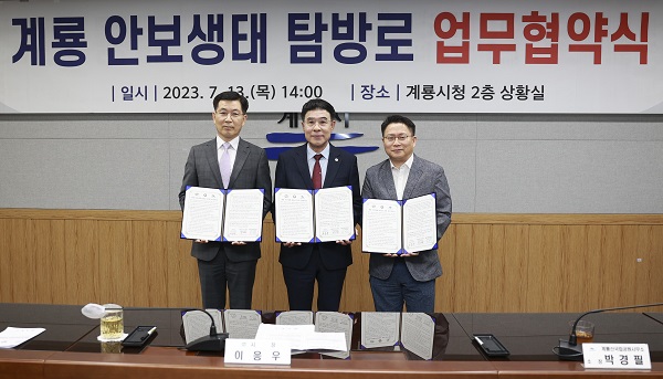 계룡시(시장 이응우)는 지난 13일 시청 상황실에서 계룡대근무지원단, 계룡산국립공원사무소와 계룡안보생태탐방로 정상 운영을 위한 업무협약을 체결했다고 밝혔다.