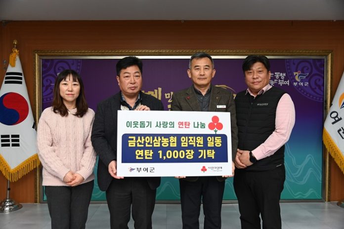 금산인삼농협(조합장 강상묵) 임직원은 최근 부여군에 이웃사랑 나눔 기탁으로 ‘사랑의 연탄 1,000장’을 기탁했다.