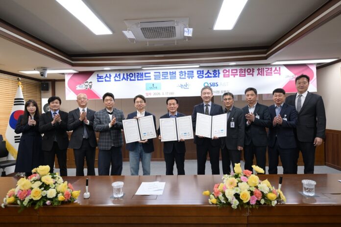 논산시(시장 백성현)는 17일 ㈜SBS A&T, 드라마 제작사 ㈜낭만크루와 ‘선샤인랜드 글로벌 한류 명소화 업무협약’을 체결하고, 콘텐츠 기반 관광 활성화에 본격 나선다고 밝혔다.
