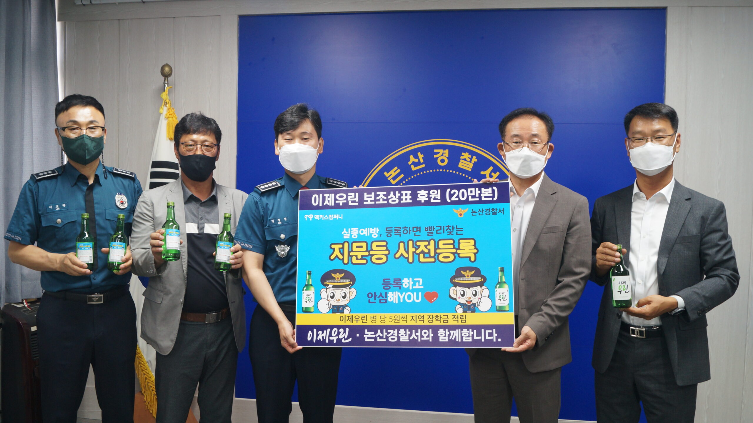❍ 논산경찰서(서장 김창영)는 지난 5일 주류업체 ㈜맥키스컴퍼니와 지문 등 사전등록제를 홍보하는 소주 보조라벨 전달식을 가졌다.