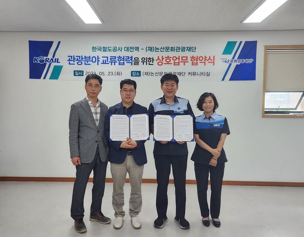 논산문화관광재단(대표이사 지진호, 이하 재단)이 지난 23일 한국철도공사 대전역(역장 이재훈, 이하 대전역)과 논산 지역 관광진흥을 위한 업무협약을 맺었다.