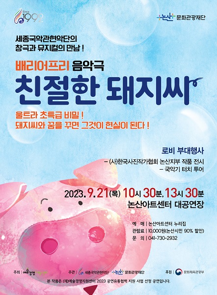 논산문화관광재단(대표이사 지진호)이 오는 21일 논산아트센터 대공연장에서 세종국악관현악단과 함께하는 배리어프리 음악극 <친절한 돼지씨> 공연을 2회(오전 10시 30분, 오후 1시 30분)에 걸쳐 진행한다.