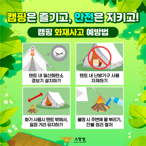 강신옥 예방안전과장은 “캠핑 등 야외 레져 인구가 늘어난 만큼 안전사고 발생 우려 또한 크게 증가했다”며, “화재나 일산화탄소 중독사고를 방지하기 위해 텐트 내에 일산화탄소 경보기를 설치하고 캠핑 안전수칙을 준수하여 즐거운 캠핑을 하기 바란다”고 전했다.