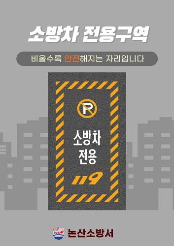 논산소방서(서장 강기원)는 화재 등 재난 발생 시 소방차량의 신속한 진입과 원활한 현장 활동을 위해 소방차 전용구역 확보에 적극적인 동참을 당부하고 나섰다.