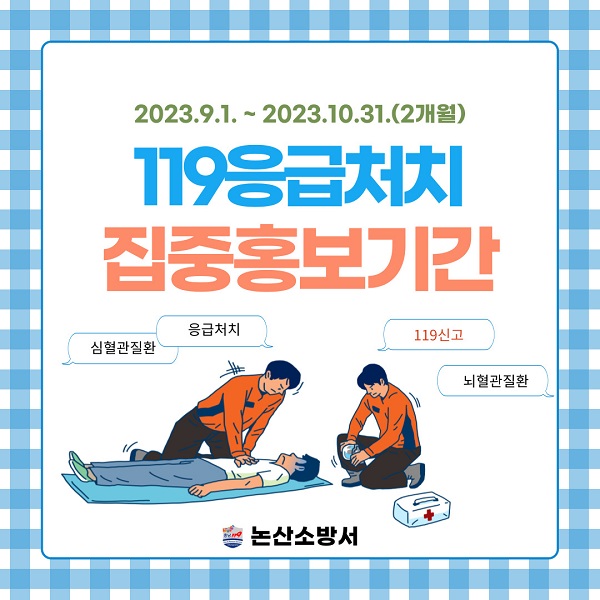 논산소방서(서장 강기원)는 위급한 상황에서 시민의 생명을 보호하기 위한 대처 능력을 향상하기 위해 내달 31일까지 응급처치 집중 홍보 기간을 운영한다고 밝혔다.