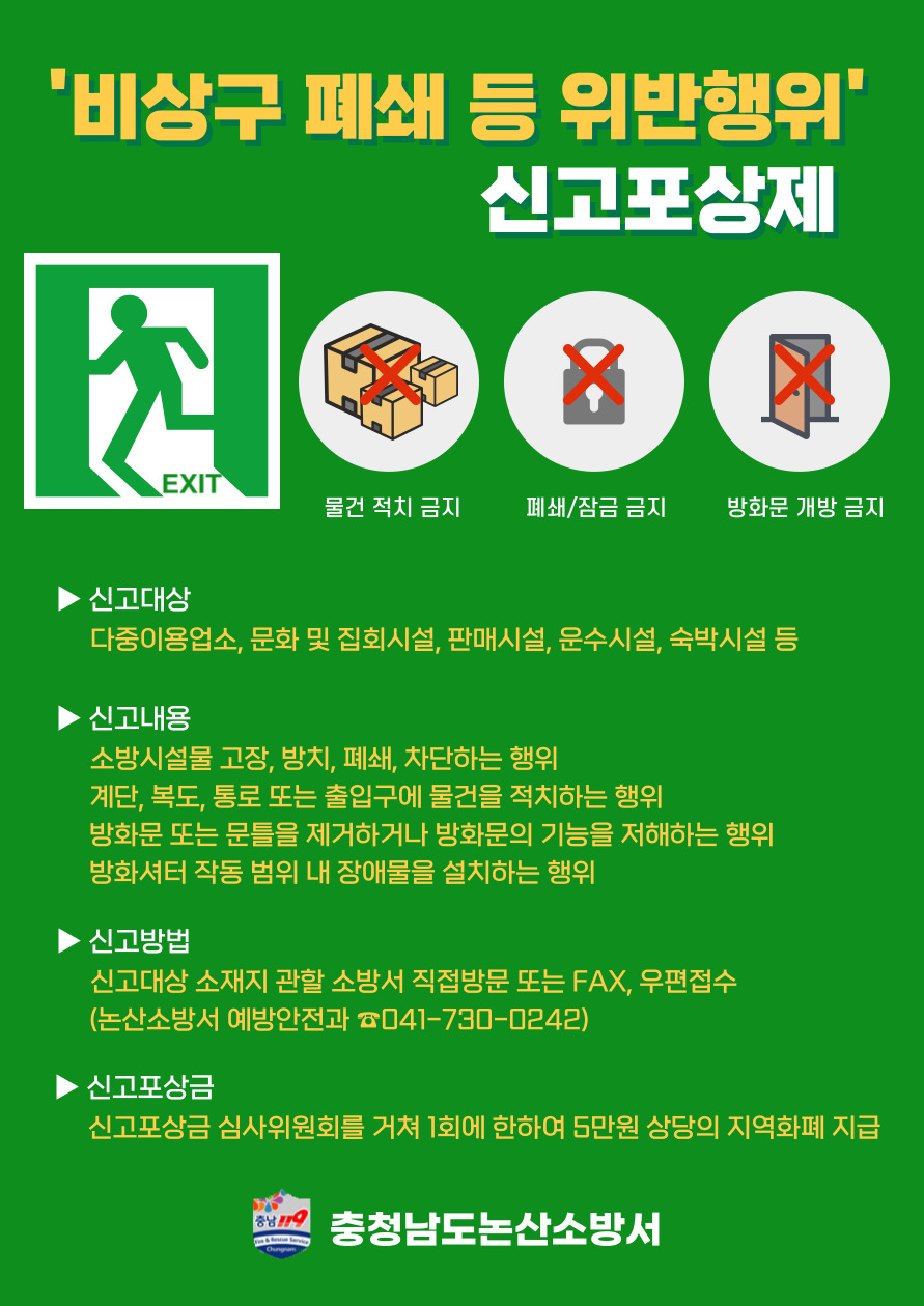 논산소방서(서장 강기원)는 비상구 확보에 대한 경각심과 안전의식을 높이기 위해 불법행위 신고포상제를 상시 운영한다고 밝혔다.