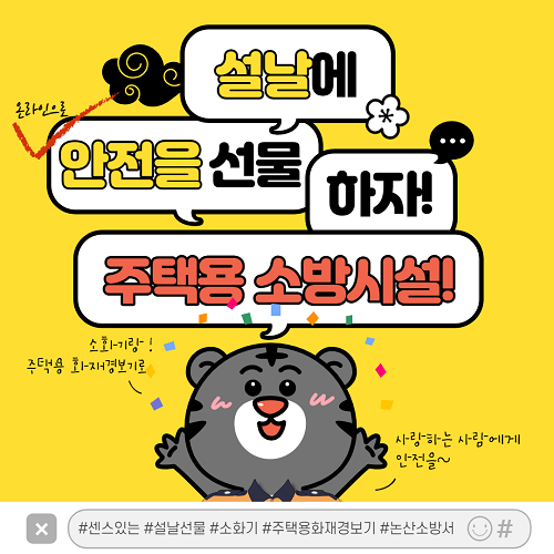 논산소방서(서장 강기원)는 주택용 소방시설 설치 촉진ㆍ보급 확산을 위해 설 명절을 맞아 ‘주택용 소방시설 온라인 선물하기’ 집중 홍보를 실시한다고 밝혔다.