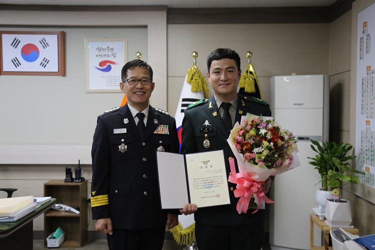논산소방서(서장 강기원)는 지난 28일 오전 소방서장 집무실에서 신속한 대응으로 대형화재를 막은 육군훈련소 소속 문성민 중사에게 논산소방서장 표창장을 수여했다고 밝혔다.