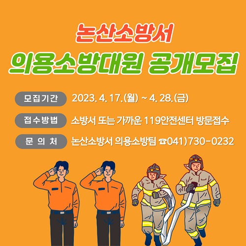 신청방법은 모집기간 내 논산소방서 홈페이지에 게시된 지원신청서를 작성하여 논산소방서 의용소방팀 또는 가까운 119안전센터에 제출하면 1차 서류 2차 면접을 통해 최종 선발한다. 자세한 사항은 전화 041-730 -0232로 문의하면 된다.