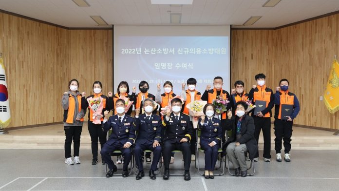 논산소방서(서장 이희선)는 지난 29일 소방서 4층 대회의실에서 2022년 하반기 신규 의용소방대원 11명에 대한 임명장 수여식을 실시했다고 밝혔다.
