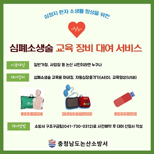 대여 가능한 교육장비는 교육용 성인 마네킹(반신), 교육용 자동심장충격기 , 심폐소생술 교육 영상 USB 등이 준비돼 있으며, 대여에 관한 사항은 소방서 구조구급팀(041-730-0312)으로 문의하면 된다.