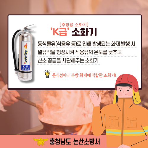 주방에서 사용되는 동·식물유는 일반적으로 사용되는 분말소화기로 화재표면의 화염을 일시적으로 제거할 수 있으나, 완전한 소화가 어렵고 재발화할 가능성이 크므로 기름 표면에 막을 형성해 재발화를 차단해주는 주방용(K급) 소화기를 사용하는 것이 적합하다.