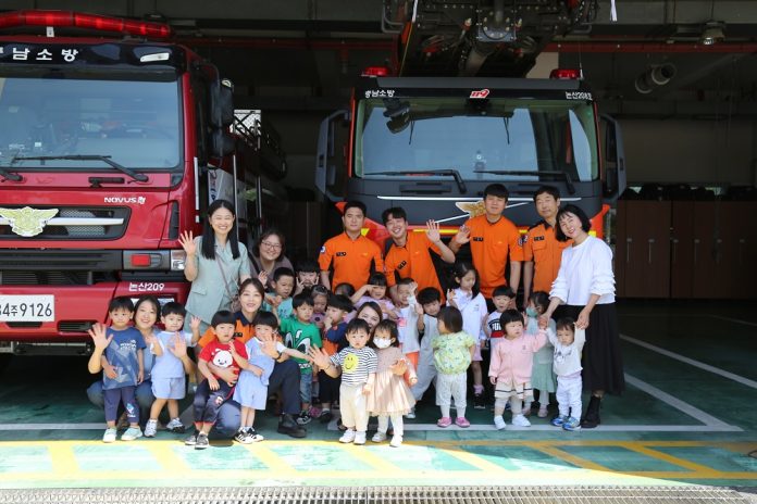 논산소방서(서장 강기원)는 지난 23일 오전 GLS어린이집 원생 20여 명을 대상으로 어린이 눈높이에 맞춰 안전의식을 높일 수 있도록 소방서 견학 및 안전체험교육을 실시했다고 밝혔다.