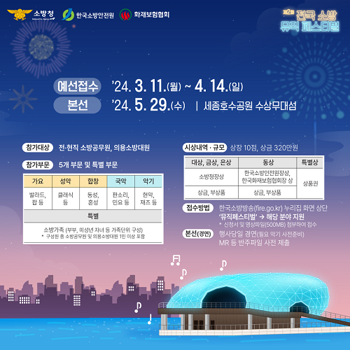 이번 전국 소방 페스티벌은 오는 5월 29일 세종호수공원 수상무대섬에서 개최되며 음악을 통해 소방공무원의 자긍심을 고취하고 소방안전문화를 확산하고자 추진되었다.
