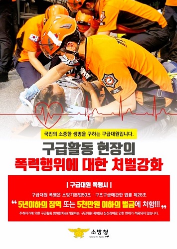 현행 ‘소방기본법’ 제50조와 ‘119구조ㆍ구급에 관한 법률’ 제28조에 의하면 소방대원에게 폭행 또는 협박을 행사해 구조ㆍ구급활동을 방해한 자는 5년 이하 징역 또는 5000만원 이하의 벌금에 처하도록 규정돼 있다.