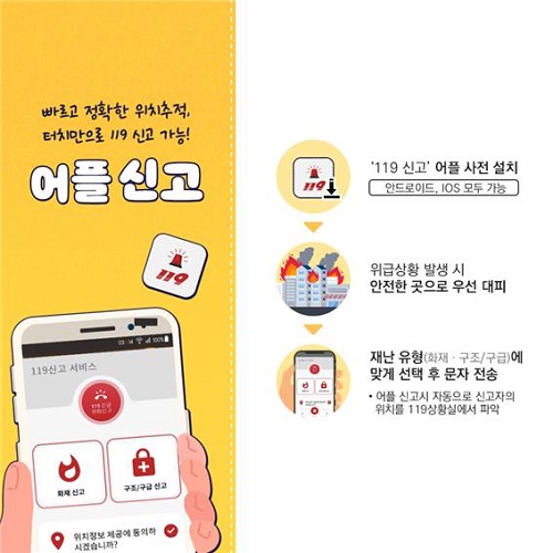 특히 앱을 통한 신고는 재난 유형(화재·구조·구급)에 맞게 선택 후 문자를 보내 신고하면 신고자의 GPS 위치정보가 119종합상황실로 전송되기 때문에 빠르고 정확하게 신고자의 위치확인이 가능하다.