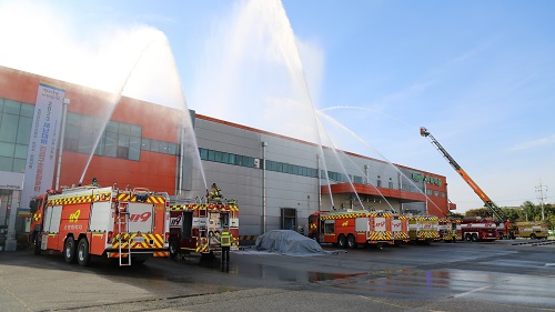 훈련은 한미식품 논산공장에서 전기차 충전 중 발생한 화재가 공장동으로 확산, 건물 일부가 붕괴되고 다수의 사상자가 발생한 상황을 가정해 ▲재난 발생에 따른 상황전파·신고 ▲자위소방대 초기 대응활동 ▲건물 붕괴 및 화재발생에 따른 인명구조와 화재진압 ▲긴급구조통제단 가동 및 유관기관 현장활동 ▲상황조치 보고 및 훈련 강평 순으로 진행됐다.