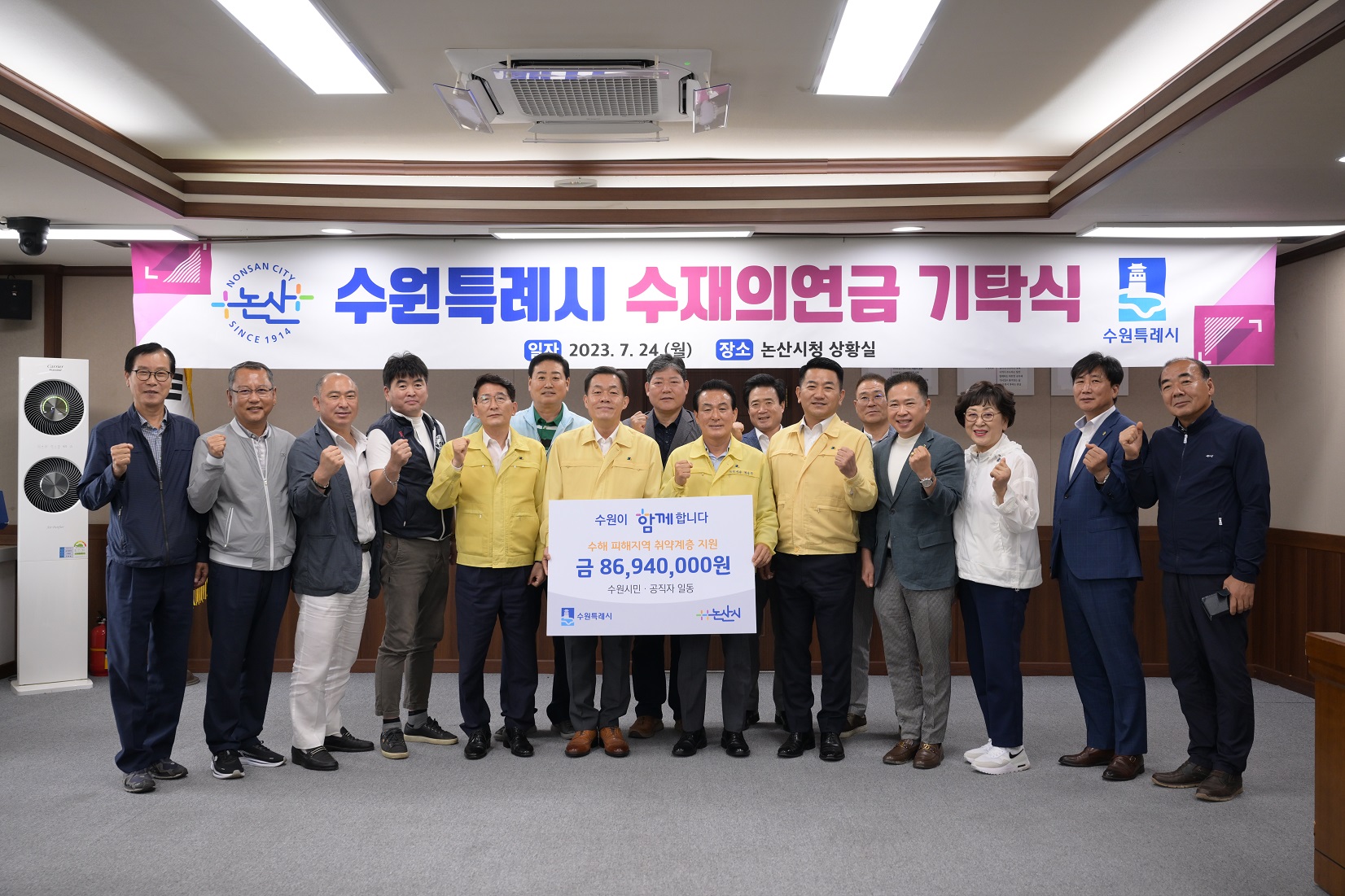 수원특례시 공직자를 포함해 협업기관 직원, 민간 단체 구성원들은 지난주 자율적으로 수해복구 성금을 모금, 총 1억 1,694만 원을 마련했다. 이중 논산시로 8,694만 원을 전달했으며 잔여 성금 3,000만 원은 7월 말경 경북 봉화군에 전할 예정이다.
