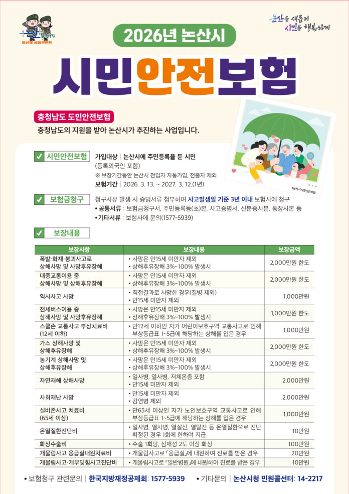 논산시(시장 백성현)는 시민들이 일상생활 중 발생할 수 있는 각종 재난과 안전사고에 대비하기 위해 시민 안전 보험을 운영하고 있다.