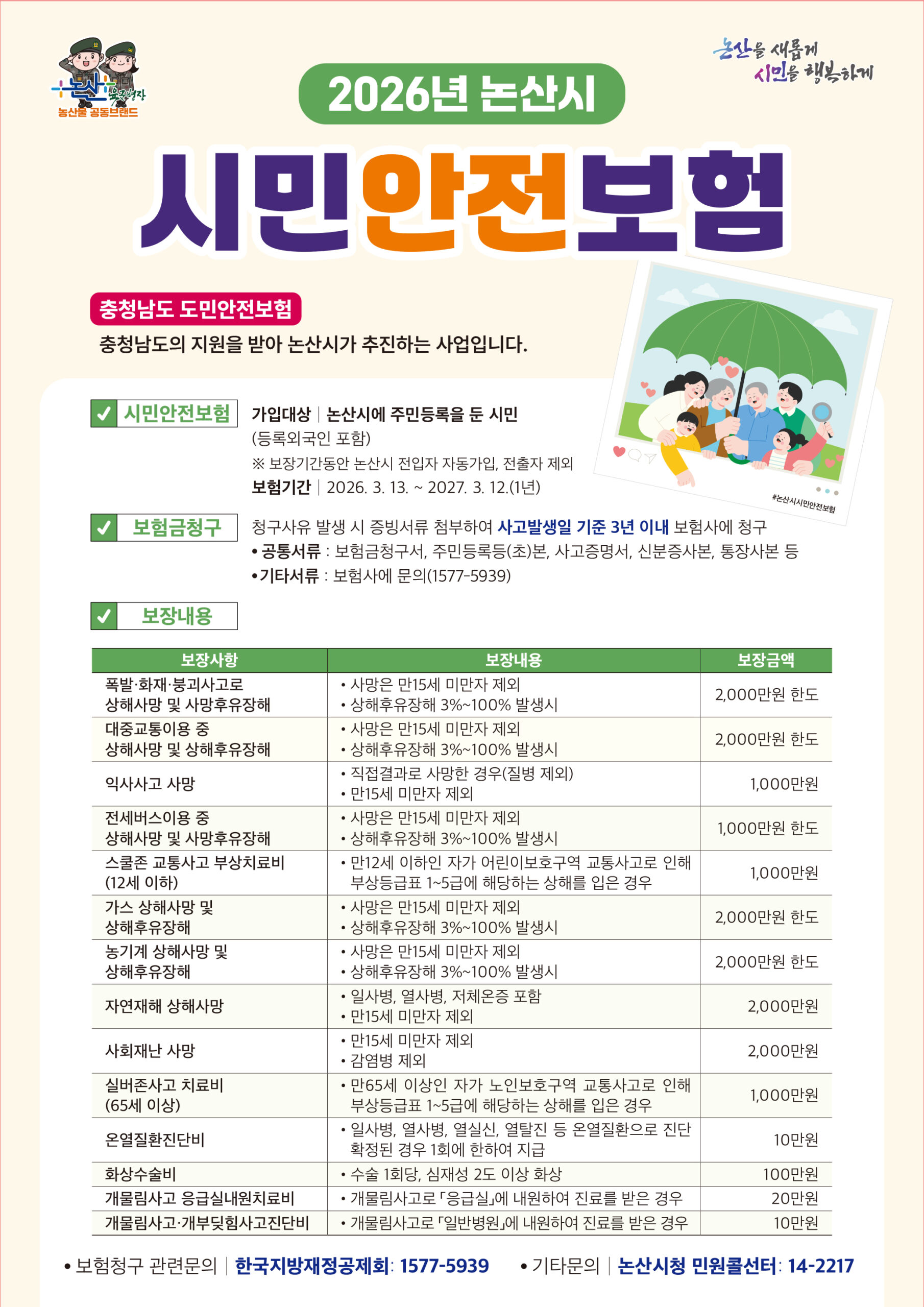 보장내용은 폭발‧화재‧붕괴사고로 인한 상해사망 및 상해후유장해, 대중교통이용 중 상해사망 및 상해후유장해, 익사사고 사망, 어린이보호구역(스쿨존) 교통사고 부상치료비(12세 이하), 개물림사고·개부딪힘사고진단비(기존 응급실 진료에서 일반병원 진료까지 보장 확대) 등 19가지 항목이다.