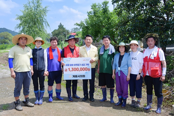 논산시의회(의장 서원)는 28일 계룡시의회(의장 김범규)로부터 수재의연금 130만원을 전달받고 수해복구 지원 활동을 함께 펼치며 구슬땀을 흘렸다.