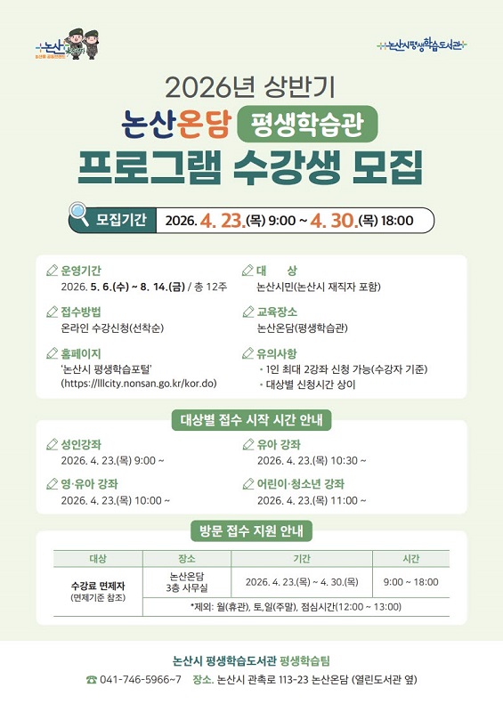 자세한 사항은 논산시 평생학습포털 또는 평생학습도서관 평생학습팀(☎041-746-5966)을 통해 확인할 수 있다.