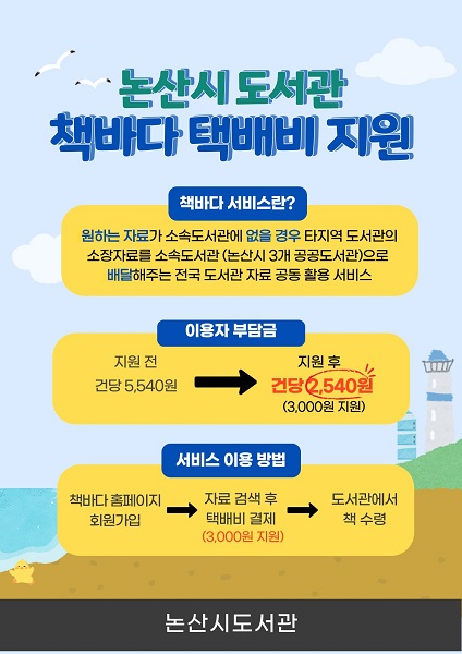 논산시(시장 백성현)가 운영하는 시립 도서관(논산열린ㆍ강경ㆍ연무)에서 오는 9월 1일부터 ‘책바다 서비스’의 택배비를 지원한다.
