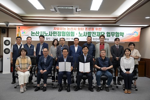 논산시 노사민정협의회(위원장 백성현 논산시장, 이하 협의회)는 지난 12일 논산시청 상황실에서 노사발전재단(사무총장 김대환, 이하 재단)과 노사민정협의회 위원 20여 명이 참석한 가운데‘차별 없는 일터 조성 및 공동 협력사업 발굴’을 위한 업무협약을 체결했다.