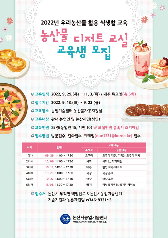 논산시농업기술센터(소장 김정필)는 오는 9월 13일부터 23일까지 올바른 식문화 정착 및 지역 농산물 가치 제고를 위한 ‘농산물 디저트 교실 교육생’을 모집한다.