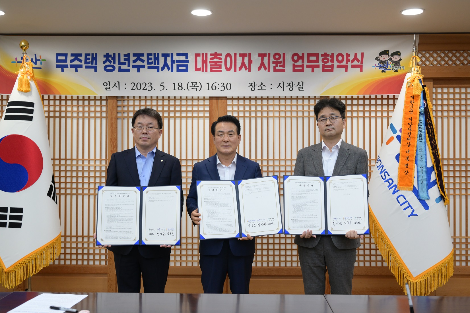 논산시는 지난 18일 한국주택금융공사ㆍNH농협은행논산시지부ㆍ하나은행 논산지점과 전ㆍ월세 대출이자 지원 관련 업무협약을 체결했다고 밝혔다. 각 주체들은 지역 청년들의 주거 안정성을 확보하고 튼튼한 자립 기반을 조성하고자 협약에 뜻을 모았다.