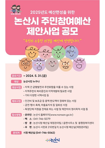 논산시(시장 백성현)가 다음달 31일까지 시 슬로건인“논산을 새롭게, 시민을 행복하게”를 바탕으로 2025년도 예산편성을 위한 주민참여예산 제안사업 공모를 진행한다고 밝혔다.