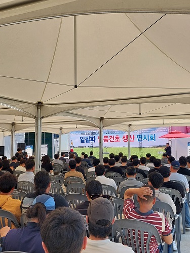 농촌진흥청 및 시‧군센터 관계자와 관내 농업인 등 약 200여 명이 참석한 이번 연시회에서는 안정적으로 재배한 국내산 알팔파를 수확하여 열풍건초로 생산하는 기술을 소개 및 시연했다. 또한 연시회 참석자들은 알팔파 품질을 평가하고 열풍건조시스템의 작동 원리와 실제 가동 모습 등을 살피며 영농 적용성을 강구해보는 시간을 가졌다.