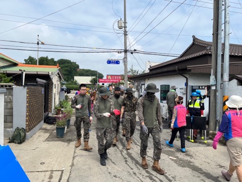 우선 12일 피해가 큰 침수지역인 강경읍과 벌곡면 등 7개소에 1대대 및 육군제32보병사단(이하 32사단) 280여명을 포함해 자원봉사 센터 모집 봉사자, 논산의용소방대, 모범운전자회 등 약 430명의 자원봉사 인력을 투입해 침수 피해 가구 토사물 제거 및 파손시설 철거 작업을 실시했다.