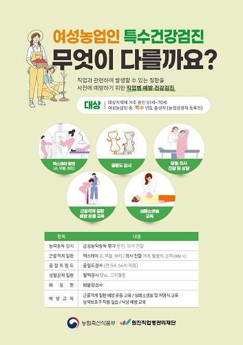 여성농업인 특수건강검진 사업은 농림축산식품부가 주관하는 공모사업으로 농업경영체에 등록된 만 51세~70세 연령 중 짝수년도 여성농업인 대상으로 한다.