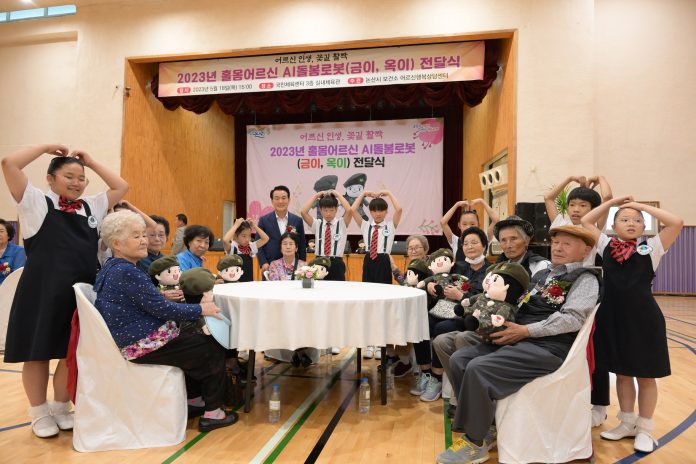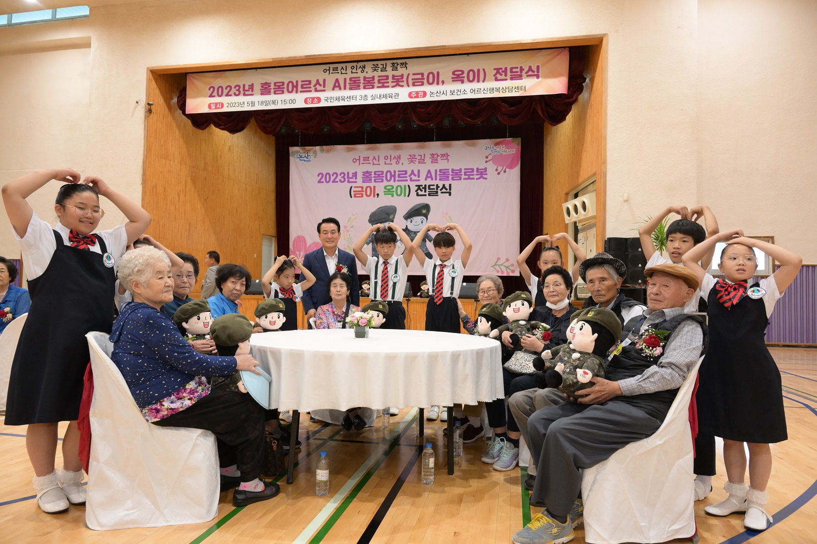 논산시는 18일 국민체육센터 3층에서 홀몸 어르신과 어르신 상담사, 자원봉사자 등 100여 명이 참석한 가운데, ‘AI 돌봄 로봇 전달식’을 가졌다. 논산파랑새합창단원들이 전달자로 나서 어르신들에게 AI 돌봄 로봇을 선물했다.