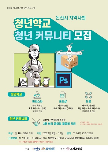 청년학교 프로그램은 △바리스타 △ 포토샵 △ 드론 3개 강좌로 수강료는 무료이며, 청년커뮤니티 지원사업은 3인 이상 청년들로 구성된 5개 내외 동아리를 선정해 활동비를 지원한다.