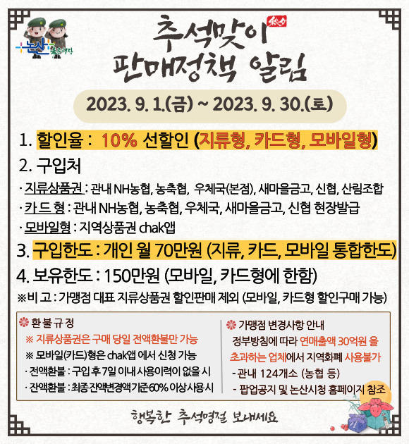 기존에는 모바일형의 경우에만 10% 할인가로 충전할 수 있었으나, 시는 추석을 맞아 많은 시민들이 지역화폐로 명절 성수품을 마련할 수 있도록 지류형ㆍ카드형으로도 할인 범위를 넓혔다.
