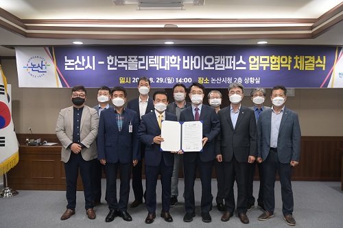 논산시(시장 백성현)는 29일 시청 2층 상황실에서 ‘논산시-한국폴리텍대학 바이오캠퍼스 업무협약’을 체결하고, 상생협력을 통한 바이오 기술 및 식품 연구개발에 힘을 모을 것을 약속했다.