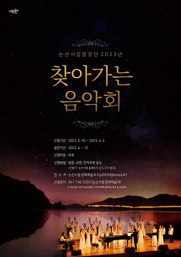 논산시(시장 백성현)가 시민에게 다채로운 문화 향유의 기회를 제공하고자 ‘2023년 찾아가는 음악회’를 기획하고, 함께 공연 무대를 꾸밀 기관을 모집한다.
